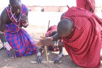 Tot slot van de safari hebben we nog een Masai dorp bezocht. We mochten in het dorp rondkijken (tegen betaling!) en foto's maken. De Masai begroetten ons met een welkomstdans met sprongen, we mochten in één van de kleine stronthutjes naar binnen en zagen hoe ze met alleen hout vuur wisten te maken.