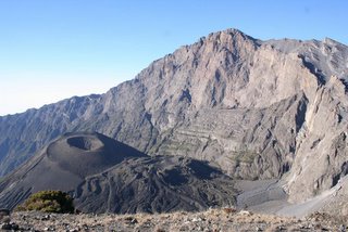 Op de terugweg naar beneden zien we in het ochtendlicht de spectaculaire kam van de Meru die we hebben beklommen en de zwarte vulkaankrater.