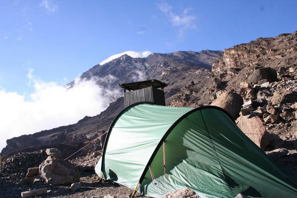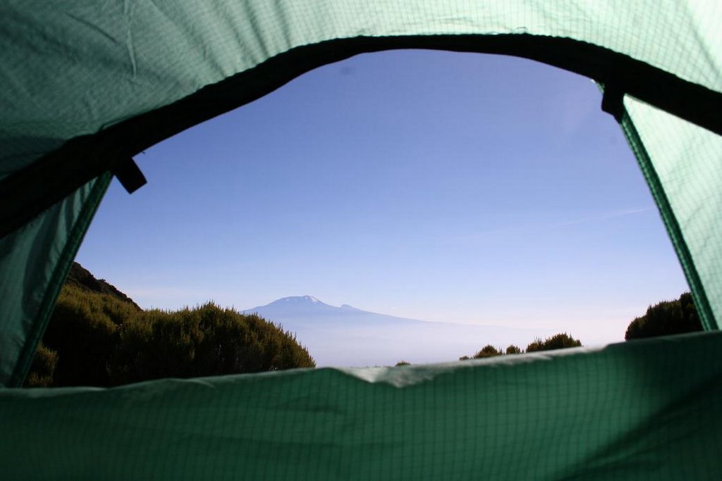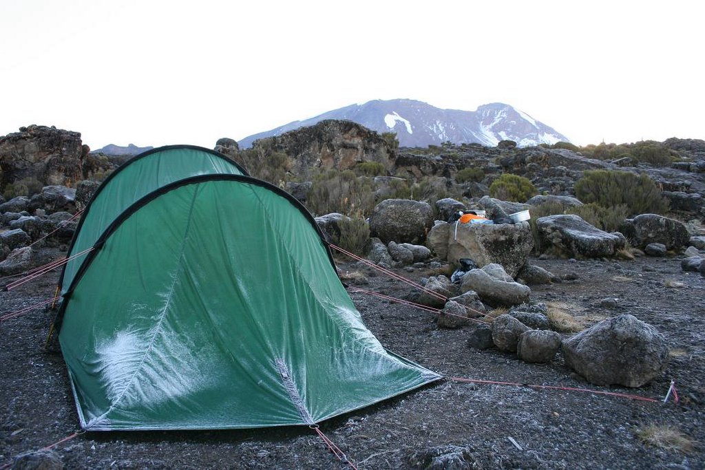 Weer terug bij onze tent op 3500m rusten we uit van de inspannende nacht en kijken vanuit de tent op de Kilimanjaro.