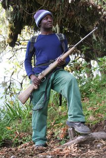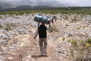 Door de populariteit van de Kilimanjaro wordt de berg bevolkt door een enorm leger gidsen en dragers (gemiddeld 5 per trekker). De meest gemakkelijke manier om spullen te vervoeren was voor de Afrikanen op hun hoofd (zelfs RUGzakken!). Roelf hield dit ook twee seconden vol...