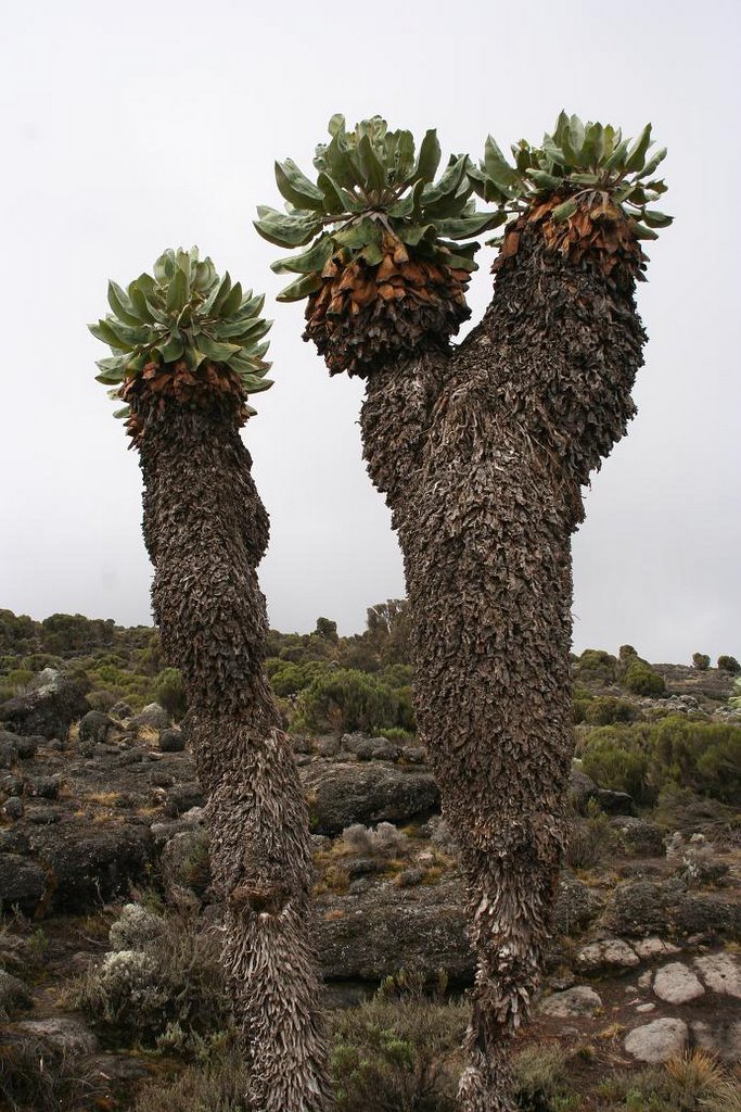 Voor de weg naar de top hadden we gekozen voor de wat minder gebruikelijke Shira-route. Dit betekende dat we de eerste twee dagen over een prachtige hoogvlakte liepen met heide-planten tot wel drie meter hoog. Ook andere reusachtige planten bloeiden volop op plaatsen in het hooggebergte waar je ze nou niet zo snel zou verwachten.