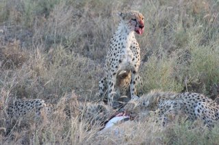 De gazelle werd gedood en daarna riep de cheetah zijn vriendjes erbij en gingen ze met z'n drieën de gazelle opeten. Dit allemaal slechts een paar meter van ons vandaan!
