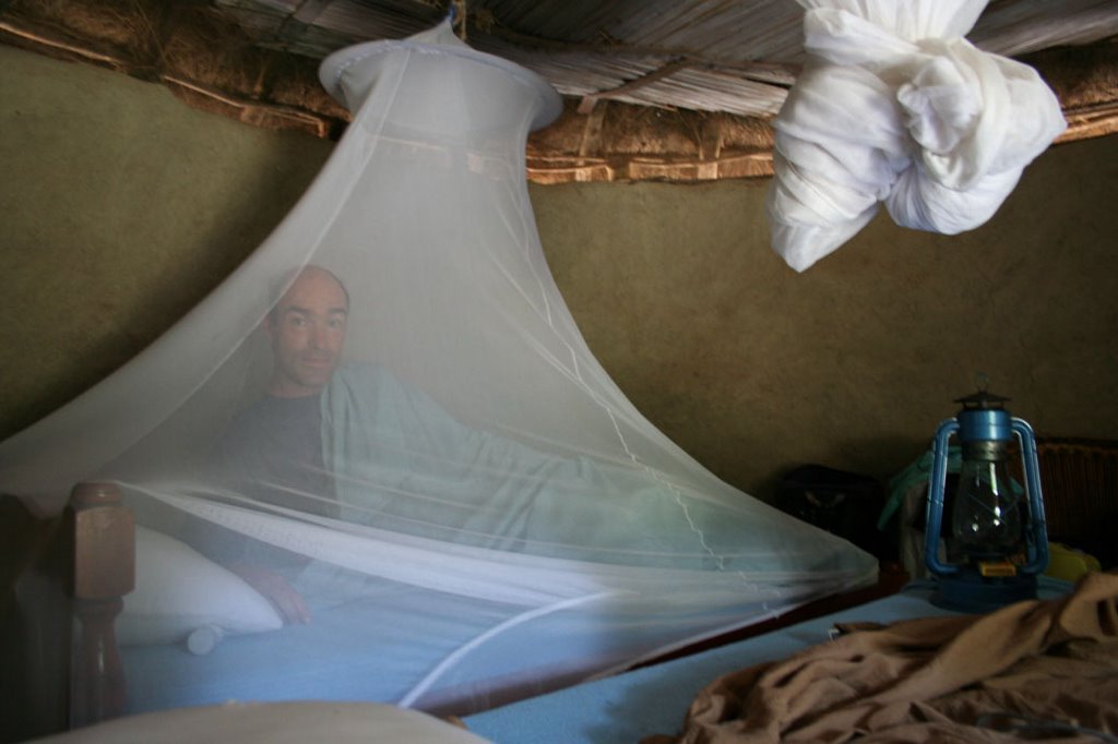 We hebben geslapen in een 'banda', een klein Afrikaans huisje met twee bedden erin en voorzien van klamboes. De verlichting bestaat uit een olielamp.