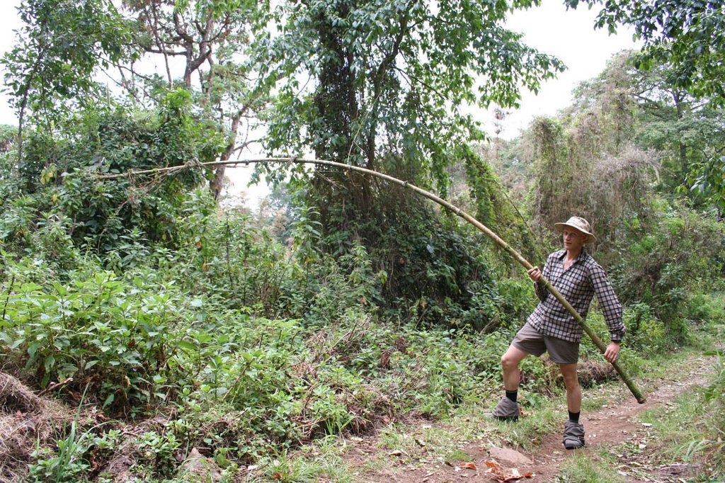 We liepen door bamboebos met meterslange bamboebomen.