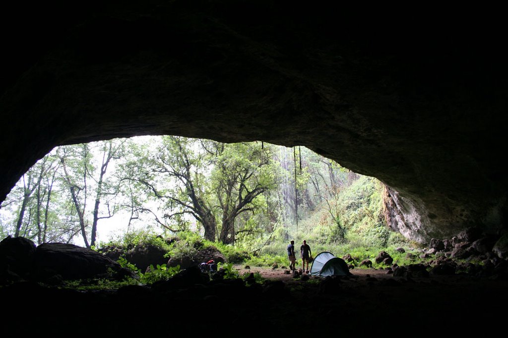De laatste nacht hebben we met de tent in een enorme grot vol met vleermuizen gestaan waar een waterval voor de opening naar beneden kwam. Echt een bijzondere plek.