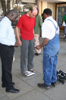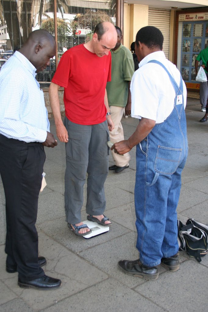 Op straat kun je jezelf wegen voor een paar cent. De weegschaal is niet erg nauwkeurig (afwijking +/- 10 kilo) want uit het 'gezondsheidadvies' van de brave Keniaan kwam dat ik te zwaar was en in de 'gevarenzone' zit! En dat terwijl ik deze reis alweer zo'n 5 kilo kwijt ben geraakt...